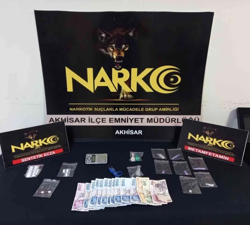 Manisa İl Emniyet Müdürlüğü Akhisar Narkotik Suçlarla Mücadele Grup Amirliği görevlilerince uyuşturucu veya uyarıcı madde ticareti yapan, nakleden ve kullanan şahıslara yönelik yapılan çalışmalarda Akhisar ilçesinde durdurulan bir araçta yapılan aramada; 7 parça halinde 3,57 gram metamfetamin maddesi, 17 adet sentetik ecza hapı, 1 adet hassas terazi, 1 adet uyuşturucu kullanmaya yarayan aparat, 2 adet ölçüm yapmaya yarayan aparat, 1 adet uyuşturucu paketlemede kullanılan makas ve uyuşturucu madde ticaretinden elde edildiği değerlendirilen bin 285 TL para ele geçirildi. Konuyla ilgili 2 şüpheli şahıs ’Uyuşturucu veya uyarıcı madde imal ve ticareti yapmak’ suçundan gözaltına alınarak haklarında adli işlemlere başlandı.