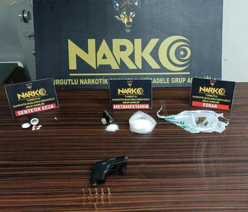 Manisa İl Emniyet Müdürlüğü Turgutlu Narkotik Suçlarla Mücadele Grup Amirliği görevlilerince uyuşturucu veya uyarıcı madde ticareti yapan, nakleden ve kullanan şahıslara yönelik yapılan çalışmalarda Turgutlu ilçesinde bir otel odasında yapılan aramada; 101,36 gram metamfetamin maddesi, 3,86 gram esrar maddesi, 5 adet sentetik ecza hapı, 1 adet 7.65 mm ruhsatsız tabanca ve 11 adet 7,65 mm fişek ele geçirildi. Konuyla ilgili 4 şüpheli şahıs uyuşturucu veya uyarıcı madde imal ve ticareti yapmak suçundan gözaltına alındı. Gözaltına alınan 4 şüpheliden ikisi sevk edildikleri adli makamlarca tutuklandı.