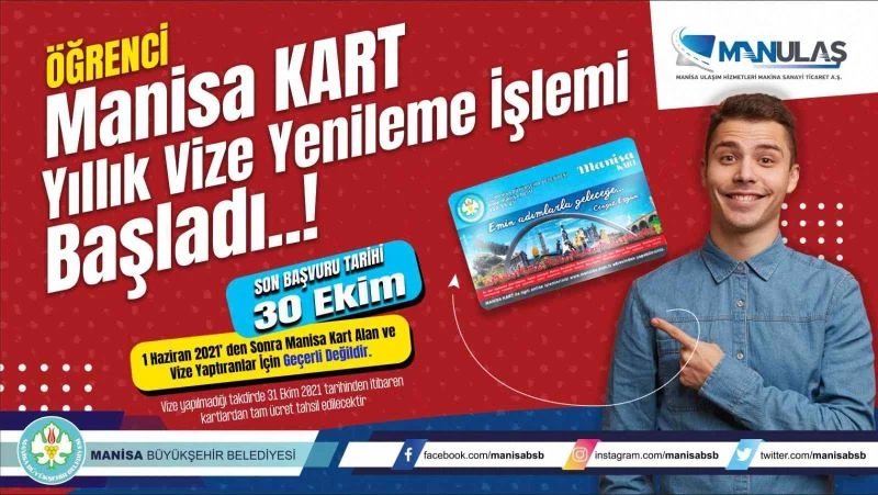 1 Haziran 2020-1 Haziran 2021 tarihleri arasında ve öncesinde Manisakart’ını alan ve toplu taşıma araçlarının indiriminden faydalanan öğrenciler için yıllık vize yenilemesi başladı. Manisa Büyükşehir Belediyesinden yapılan duyuruda, öğrencilerin toplu ulaşım araçlarından indirimli yararlanabilmesi için vize işlemini 30 Ekim tarihine kadar yaptırmaları gerektiği belirtildi.