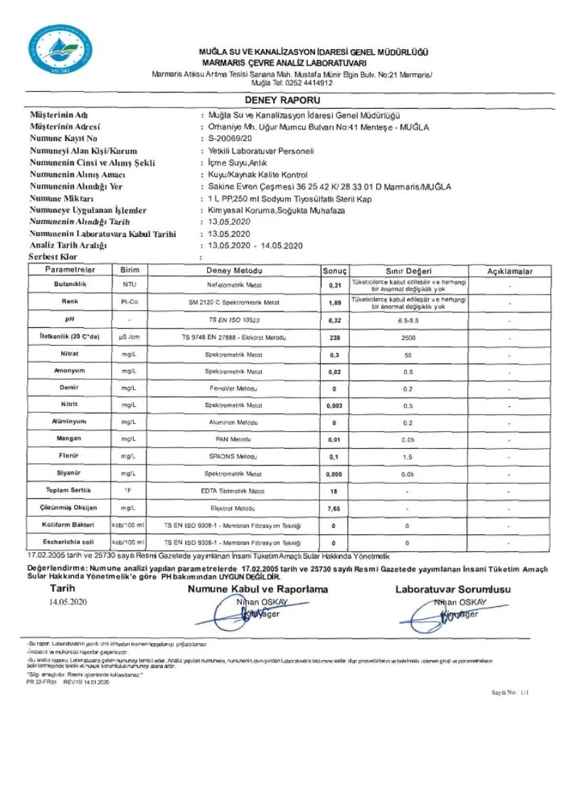 14 Mayıs’ta alınan örneklerin değerlendirmesinde Sekine Evren Çeşmesi’yle ilgili olarak “Numune analizi yapılan parametrelerde 17.02.2005 tarih ve 25730 sayılı Resmi Gazete’de yayımlanan İnsani Tüketim Amaçlı Sular Hakkında Yönetmeliğe göre PH bakımından uygun değildir” sonucu çıktı. Diğer kaynak sularının ise aynı yönetmeliğe göre koliform bakteri bakımından tüketime uygun olmadığı değerlendirmesi yapıldı.