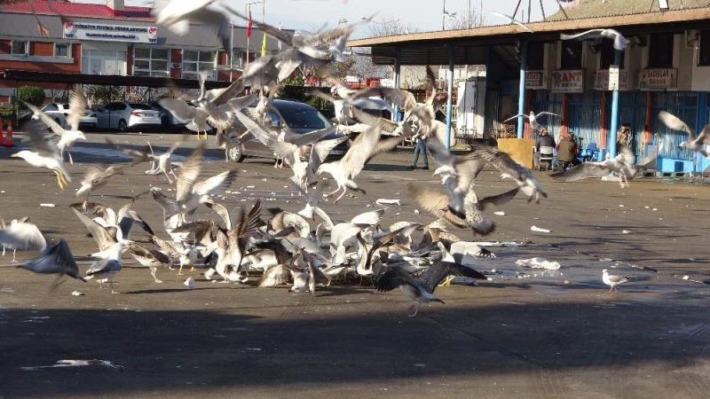 Genelde çevre işyerlerinin çatılarında kendilerine atılacak balık atıklarını bekleyen martılar balık kasasını görür görmez hemen harekete geçmeleri ilginç görüntüler oluşturuyor.