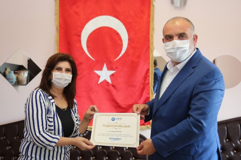 Canik Belediyesi, salgın hastalığın yayılmasını önlemeye yönelik, insanların sağlıklı kalması için tıbbı maske üreten belediye personeline teşekkür belgesi verdi.