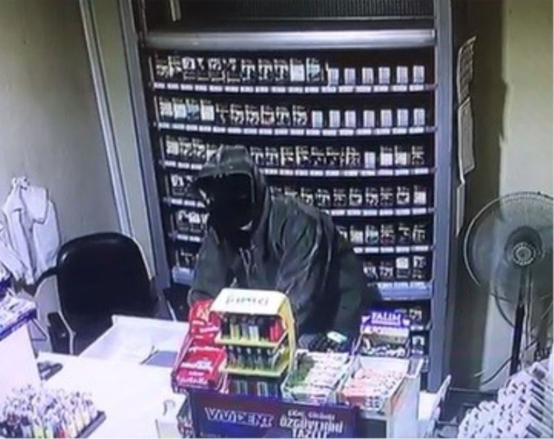 Güvenlik kamera kaydında üzerinde yağmurluk bulunan maske ile yüzü kapalı şapkalı bir kişi, sigaraları ve paralı alırken görülüyor.
