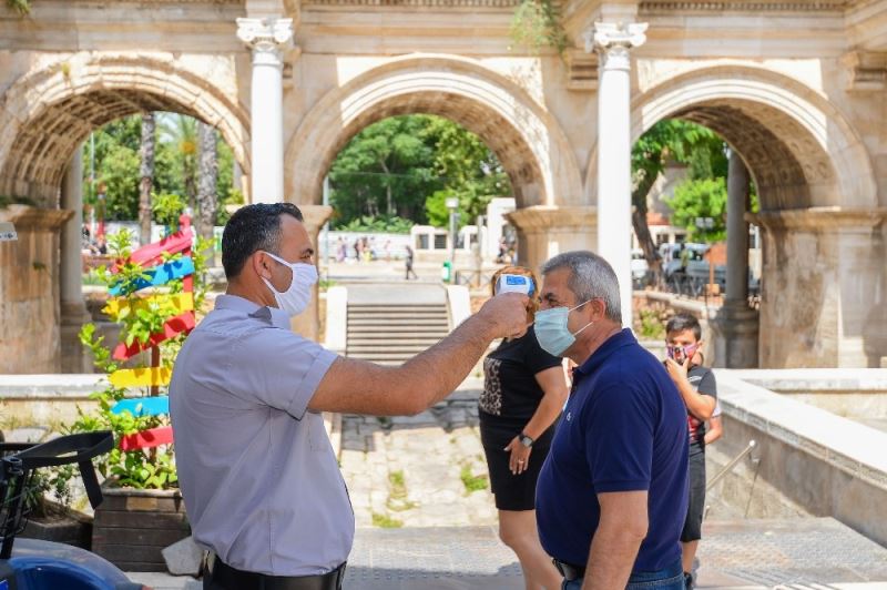 Antalya’da Muratpaşa Belediyesi, korona virüs önlemleri çerçevesinde tarihi kent merkezi Kaleiçi’nin yediye düşürülen girişlerinin üçünde, ziyaretçilerin ateşini ölçümlerini yapıyor. Maskesiz girişlerin yasak olduğu tarihi kente ateşi 38 derece ve üzerinde olan ziyaretçiler de alınmıyor.
