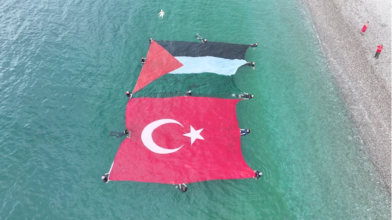 Sabah saatlerinde Konyaaltı Varyantlar mevkiinde toplanan grup, denizde Türk ve Filistin bayrakları açarak farkındalık etkinliği düzenledi.
