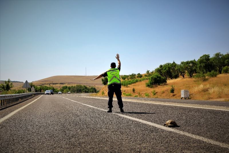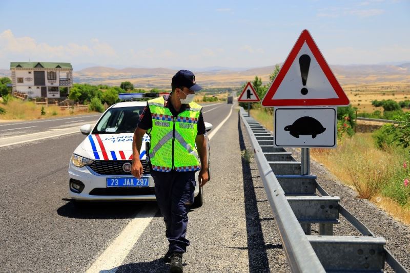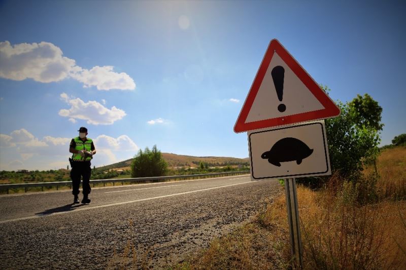 Elazığ’da artan sıcaklarla birlikte kara yoluna çıkan kaplumbağalar için günün belirli saatlerinde devriye görevi yapan jandarma ekipleri, sürücülerin dikkatli olması için uyarı levhaları yerleştirdi.Devriye sırasında karşılaşılan kaplumbağaların ise düzenli olarak yolun karşısına bırakıldığı belirtildi.