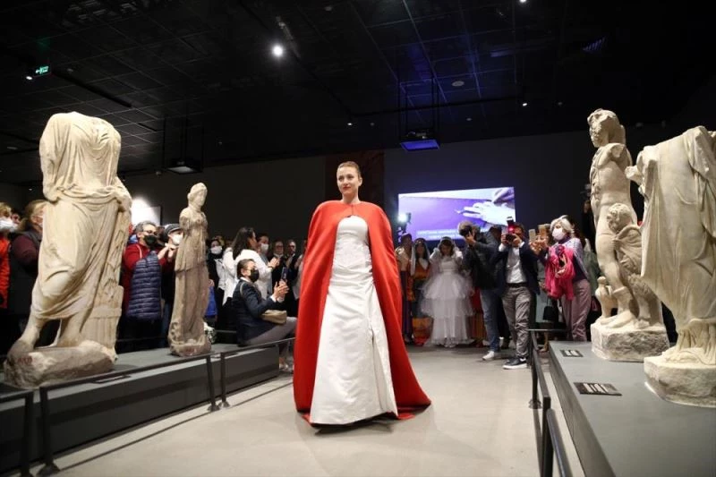 Tarihi eserlerin arasında yürüyen mankenler, özenle hazırlanan 10 tasarımı sergiledi.