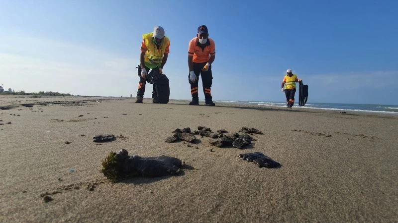 Mersin’de Suriye kaynaklı petrol sızıntısına ait atıklar görülmesi üzerine Tarsus plajında temizlik çalışması yapıldı.