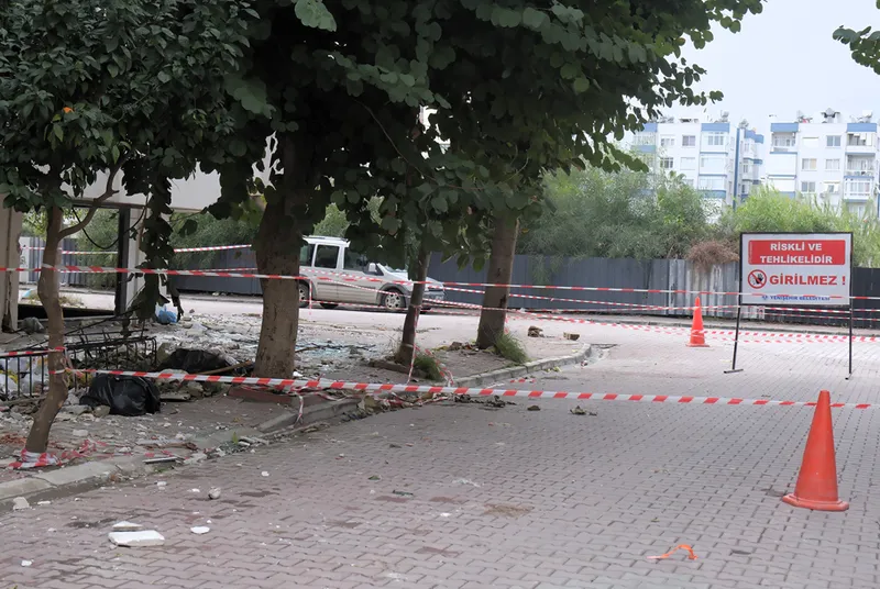 Olay nedeniyle etrafında güvenlik şeridi olan binadan sokağa moloz saçıldı.
