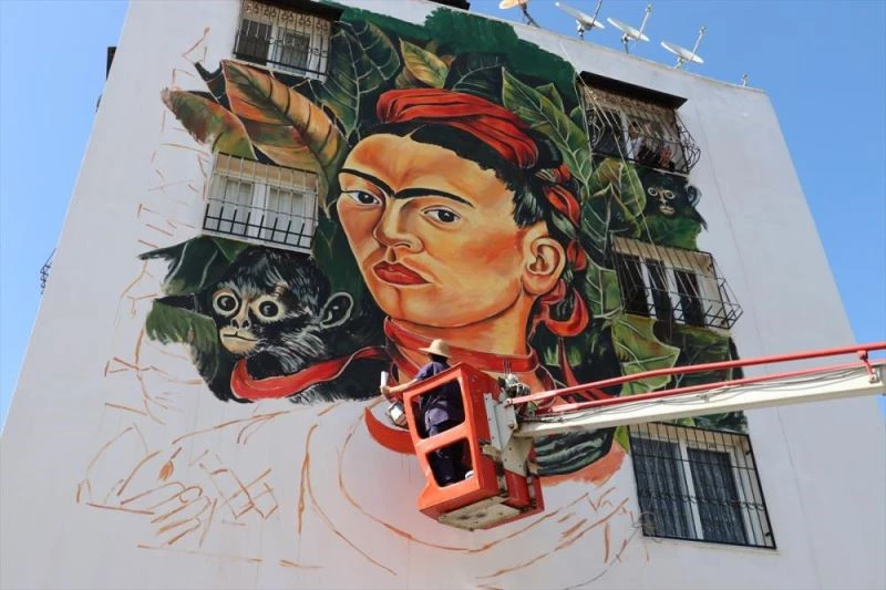 Ressam Nazife Bilgin Hazar, boyalari eskimis bir apartmanin dis cephesinde "reprodüksiyon" islemiyle dünyaca ünlü Ressam Frida Kahlo'nun "Ben ve Maymun" adli eserini resmetmeye basladi.