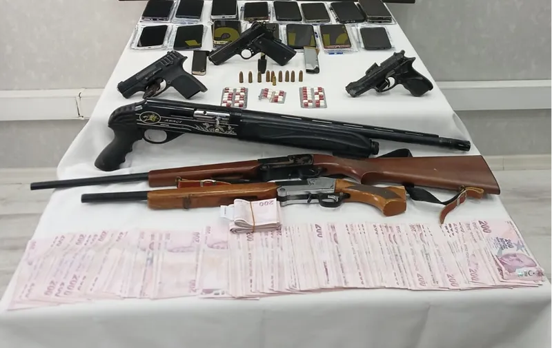 Şüphelilerin ev ve iş yerlerindeki aramada, 42 bin lira, 2 pompalı tüfek, 13 kartuş, 3 tabanca, 27 fişek, 28 cep telefonu, 28 uyuşturucu hap ve tüfek ele geçirildi.