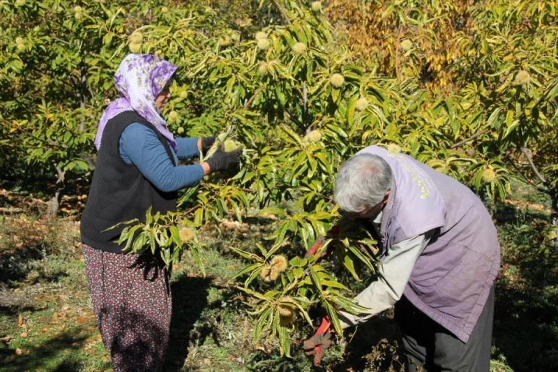 Sarıkaya Mahallesi'nde çiftçilik yapan Nihat Teke'nin 8 yıl önce ektiği kestane ağaçlarından ilk hasat yapıldı.