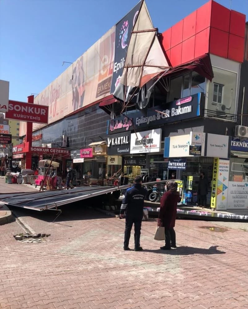 Mersin'de kuvvetli rüzgar iş yerinde asılı reklam panosunu devirdi