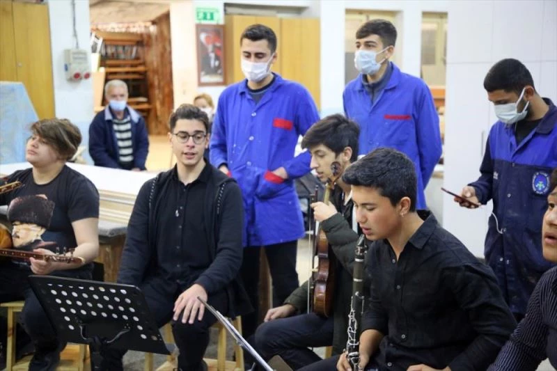 Ellerindeki enstrümanlarıyla şarkı söyleyerek atölyeye giren öğrenciler meslek lisesindeki arkadaşlarına mini bir konser verdi.