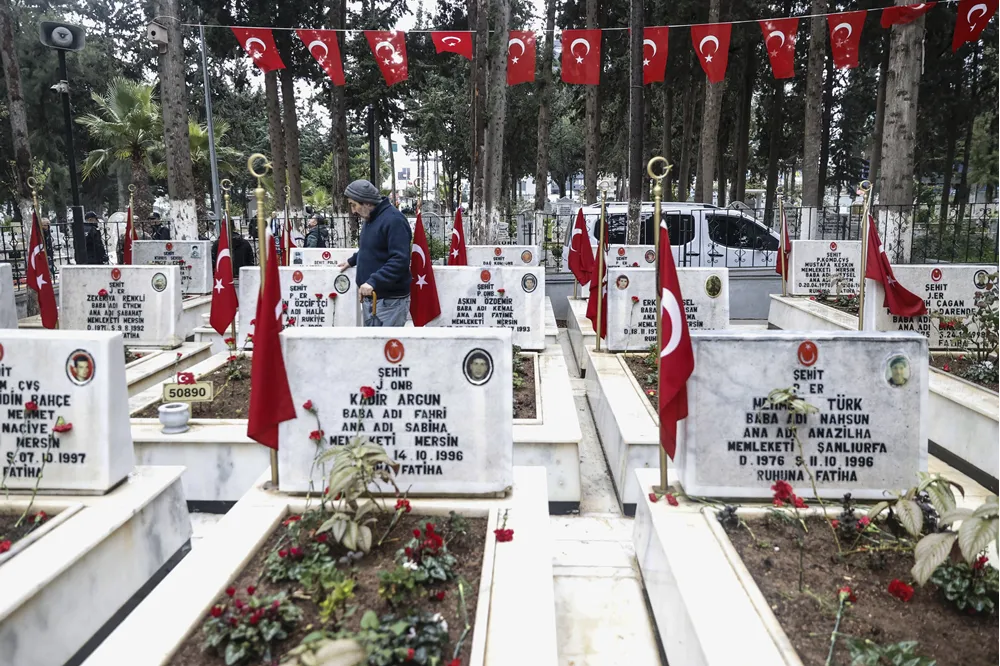 Toroslar ilçesinde Şehir Mezarlığı'ndaki şehitliğe giden aileler, Türk bayraklarıyla donatılmış mezarlara çiçek bıraktı.