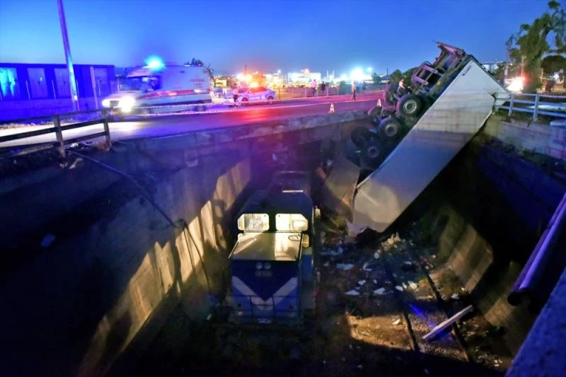 Yaklasik 10 metrelik yükseklikten tirin dorsesi, raylarda hareket halindeki yük treninin üzerine düstü. Dorseden ayrilan tir ise raylarin diger tarafina devrildi.