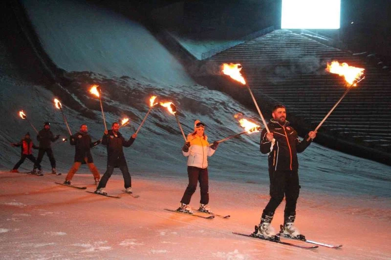 Anadolu Yıldızlar Ligi Türkiye Kayak Şampiyonası için Atlama Kuleleri’nde gerçekleşen resmi açılışta İstiklal Marşının ardından yapılan meşaleli kayak ve havai fişek gösterisi nefes kesti.