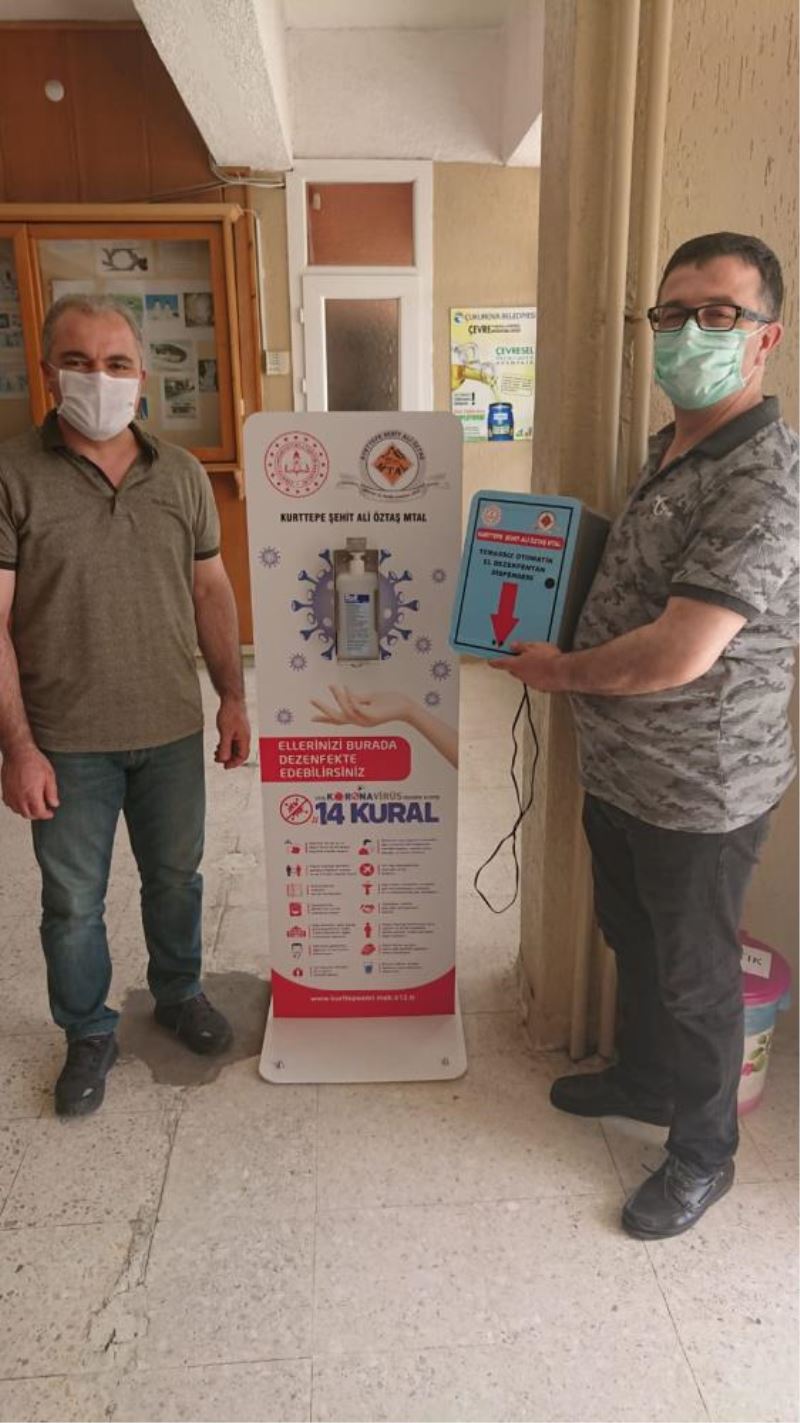 ADANA (AA) - Adana Kurttepe Sehit Ali Öztas Mesleki ve Teknik Anadolu Lisesi ögretmenleri, okul için ihtiyaç duyulan temas etmeden çalisan sensörlü dezenfektan cihazi üretti.