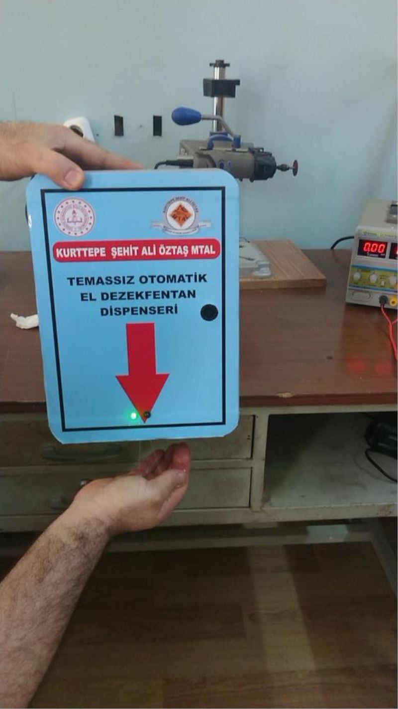 "Üretilen cihaz, temasa gerek olmadan çalismaktadir. Enerji ihtiyacini 'Günes enerji paneli' ile karsilamakta olup her kisiye verilecek dezenfektan miktarini ayarlamakta, günlük kaç kisinin kullandigini bildirmekte, dezenfektan miktari azaldiginda uyari sinyali vermektedir. Cihaz 1,5, 5 ve 10 litre kapasitelerine sahip olabiliyor. Tüm yazilim ve tasarimi okulumuz ögretmenleri tarafindan yapilmis ve piyasadaki diger ürünlerden çok daha ucuza mal olmustur."