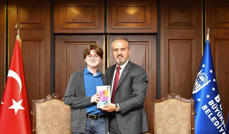 Bursa Büyükşehir Belediyesi tarafından Bursaray istasyonlarına konulan okuma kiosklarından yararlanan 50 bininci okur olan lise öğrencisi, Başkan Aktaş tarafından tabletle ödüllendirildi.