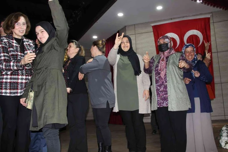 Ersoy’un konuşmasının ardından protokol üyeleri tarafından isimleri okunarak sahneye çağrılan 150 kişiye MHP parti rozetleri takıldı.