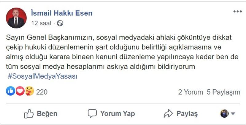 MHP’li Çankırı Belediye Başkanı İsmail Hakkı Esen, sosyal medya hesabından yaptığı açıklamada, MHP Genel Başkanı Devlet Bahçeli’nin sosyal medya hesabını askıya aldığını hatırlatarak, kendisinin de askıya aldığını açıkladı. Son paylaşımını yapan Esen, "Genel Başkanımızın sosyal medyadaki ahlaki çöküntüye dikkati çekip hukuki düzenlemenin şart olduğunu belirttiği açıklamasına ve almış olduğu karara binaen kanuni düzenleme yapılıncaya kadar ben de tüm sosyal medya hesaplarımı askıya aldığımı bildiriyorum" ifadelerini kullandı.