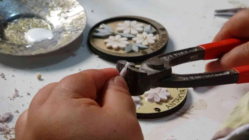 Kadınlar atölyede mikro mozaik tekniği elektronik mikroskoplarla takılara, çantalara ve aynalara minik minik mozaikleri işleyerek görenlerin büyük beğenisini topluyor.
