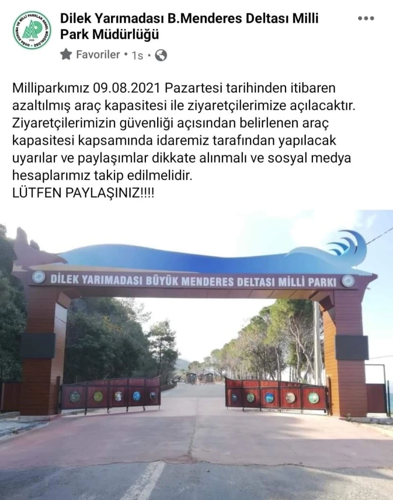 Türkiye’de halen devam eden orman yangınlarında tedbir amaçlı geçtiğimiz hafta kapılarını kapatan Dilek Yarımadası Büyük Menderes Deltası Milli Park yarın tedbirli olarak kapılarını açacağını sosyal medya hesaplarından duyurdu. Vatandaşlar Milli Parkın tedbiren kapalı kalmasını ve kapılarının ziyaretçilere açılmamasını istedi.