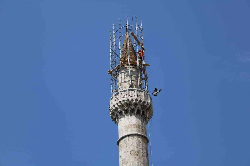 Efeler’in en eski camilerinden olan Bey Camii’nde minare yenileme çalışmaları gerçekleştirilirken, işçilerin minare tepesinde kurulan iskelede güvenlik önlemi almadan çalışmaları ise görenlerin yüreğini ağzına getirdi.