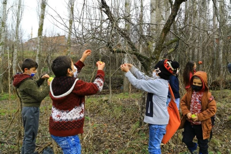 Konya’nın Hadim ilçesinde öğrenim gören ana sınıfı öğrencileri kış aylarında yiyecek bulmakta zorlanan kuşlar için kilometrelerce yol yürüyerek ağaçlara elma asıyor.