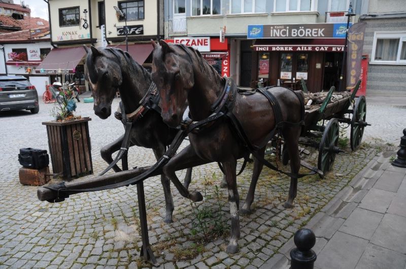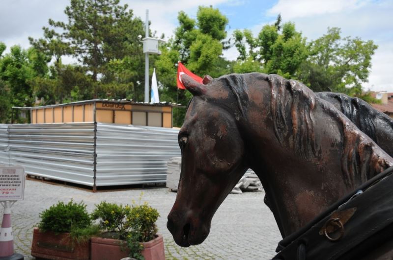 Eskişehir’in tarihi Odunpazarı Meydanı’nın simgesi haline gelen, ziyaretçilerin büyük ilgi gösterip bol bol hatıra fotoğrafı çektirdiği at arabası heykelinin üzerindeki gem ve kantarma takımları, yakındaki MOBESE kameralarına aldırış etmeyen kişi veya kişiler tarafından çalındı.