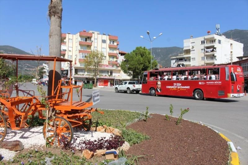 Belediye ekipleri mobil etkinlik otobüsünün geçtigi yerlerde Türk bayragi dagitarak vatandaslarin Cumhuriyet Bayramini kutladi.