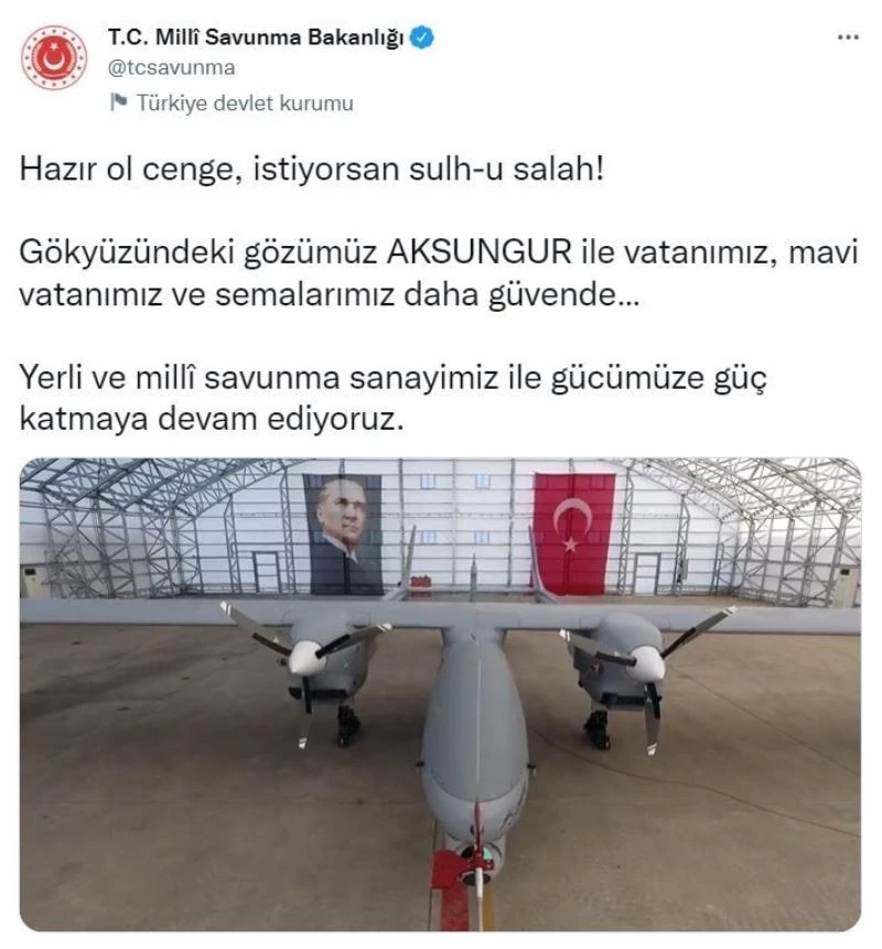 Milli Savunma Bakanlığının AKSUNGUR İHA’nın yer aldığı videolu klip paylaşımında, “Hazır ol cenge, istiyorsan sulh-u salah! Gökyüzündeki gözümüz AKSUNGUR ile vatanımız, mavi vatanımız ve semalarımız daha güvende. Yerli ve milli savunma sanayimiz ile gücümüze güç katmaya devam ediyoruz” ifadeleri kullanıldı.