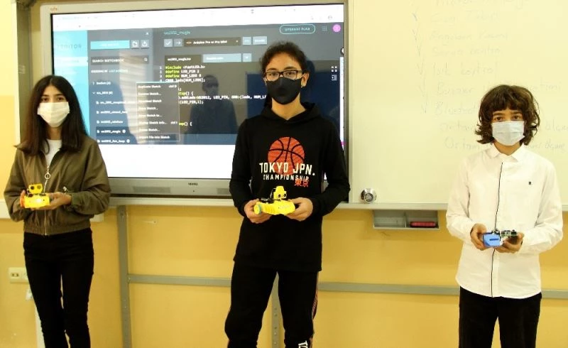 Eğitim robotunun tasarlanmasında öğrencilere öncülük yapan öğretmen Taner Akkoyunlu, “Bizim bu robotu yapmaktaki temel amacımız robotik kodlama ile ilgilenen bütün öğrencilerimizin daha ekonomik ve daha zengin içeriğe sahip robotları ede edebilmesini imkan sağlamaktı. Çıkış noktamız buydu. Robotumuzun özelliklerine gelince ana kartı bize ait, gövde tasarımı bize ait ve 3D yazıcı ile gerçekleştirdik. Bunun yanında ultrasonik mesafe sensörü engel algılayabiliyor, çizgi sensörü ile çizgi takip edebiliyor, üzerindeki seküler led ile istediğimiz ışık gösterisini yapabiliyoruz. Buzzer ile istediğimiz mürebbiyeyi üretebiliyoruz. Servo motor kontrolü ile birçok mekaniksel fonksiyonu yerine getirebiliyoruz. Motorlarımızın hız ve yön kontrolünü gerçekleştirebiliyoruz. Bluetooth kontrollü uzaktan erişim imkanına sahibiz bu robot ile. Bir öğrencimiz tüm bunları ister blok tabanda kodlama yöntemi ile ister metin tabanda kodlama gerçekleştirmek istediğinde belli bir seviyeye iyi bir seviyeye gelmiş olacağını düşünüyoruz” dedi.