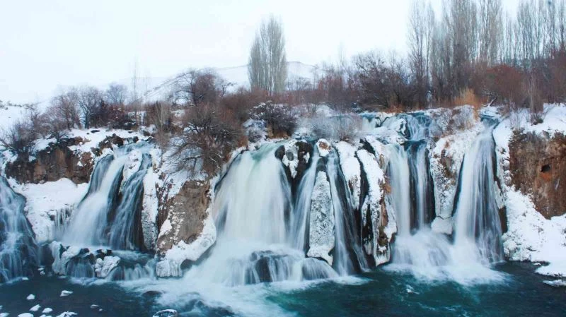 Van’ın Muradiye ilçesindeki doğa harikası Muradiye Şelalesi, beyaz örtüsüyle misafirlerine seyrine doyumsuz bir görüntü sunuyor.