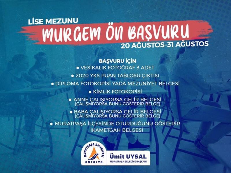 31 Ağustos’a kadar ön kayıt yaptırabilecek olan lise mezunu öğrenciler; 3 adet vesikalık fotoğraf, 2020 YKS puan tablosu çıktısı, diploma fotokopisi veya mezuniyet belgesi, Muratpaşa ilçesinde oturduğuna dair ikamet belgesi, anne ve babanın gelir belgesi, çalışmıyorlarsa bunu gösterir belge ile Kızılsaray Mahallesi’ndeki MURGEM’e ön başvuru kayıtlarını yaptırabilirler.