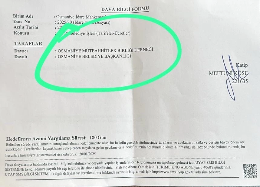 Osmaniye Müteahhitler Birliği Derneği Başkanı Şükrü Şipal konu ile ilgili olarak yaptığı açıklamada, Osmaniye Belediyesi’nin Aralık ayında içme suyu, mezarlık yerleri ve inşaat harçlarına yaptığı astronomik zammın durdurulması için dava açtıklarını ifade ederek,”Yapılan bu zaman Türkiye gerçeğine çok aykırıdır. Örneğin emekliye % 15 zam yapıldığı bir ortamda, Osmaniye Belediyesi’nin verdiği hizmetlere % 700 gibi bir zam yapması asla kabul edilemez. Piyasa şartları bellidir. Bu zamların piyasa şartlarına uygun düzeye çekilmesini istiyoruz. Bu millet bu kadar ağır bir yükü kaldıramaz. Bir çok vatandaşımızın Belediye’ye borcu bulunmaktadır ve ödeme güçlüğü çekmektedir. Bu gelen zamlarla ödeme yapmakta zorlanacaklar ve borçları daha da artacak. Bu zamların piyasa şartlarına uygun düzeye çekilmesi için bizde dava açtık. Artık kararı yüce adalet verecektir”dedi.
