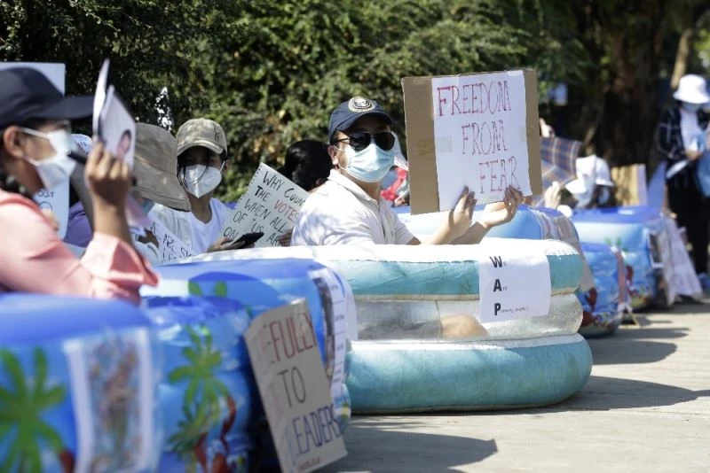 Başka bir grup ise şişme havuzlarıyla birlikte Myanmar’daki Japon Büyükelçiliği önünde toplandı.