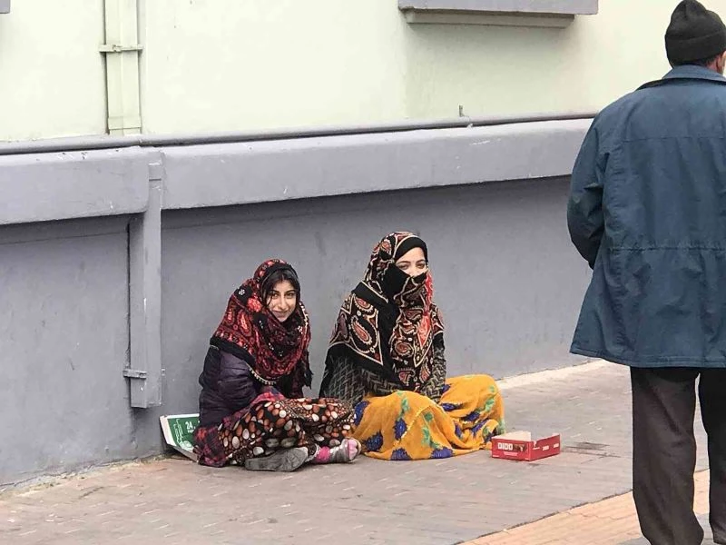 Eskişehir’in en işlek caddelerinden birinde soğuk zemine oturarak dilenen iki genç kadın, birbirleri ile sohbet edip sık sık gülerek gelip geçenlerden avuç açıp para istediler.