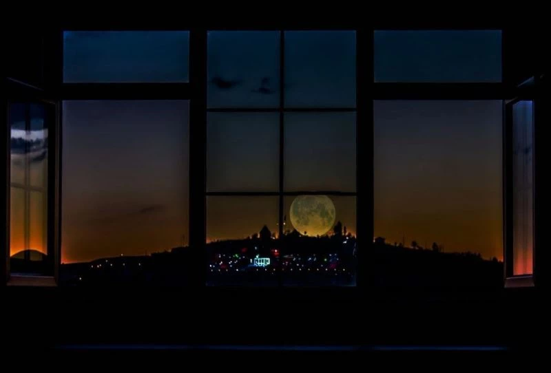 Şehit Osman Tepesi üzerindeki dolunayı pencereden farklı açıyla fotoğraflayan Eraslan, adeta ortaya kartpostallık görüntü çıkardı.