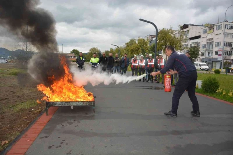 Eğitimde, Ünye İlçe Emniyet Müdürlüğü hizmet binası karşısında bulunan alanda personellere yönelik çeşitli söndürme tatbikatı da gerçekleştirildi.