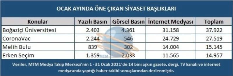 Medya Takip Merkezi (MTM), ocak ayında gündemde yer alan siyasi ve toplumsal konuları araştırarak öne çıkan başlıkları belirledi. Siyaset dünyasına yönelik, medyada yazılan haber ve yazılara dair yapılan incelemede ay boyunca en çok konuşulan konu, Cumhurbaşkanlığı tarafından Boğaziçi Üniversitesi’ne yapılan atama ve devamında yaşanan gelişmeler oldu. Türkiye İlaç ve Tıbbi Cihaz Kurumu’nun Çin’de üretilen koronavirüs aşısına onay vermesiyle başlayan aşılama süreci de gündemde sıklıkla yer aldı.
