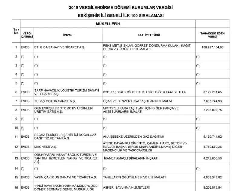 ETİ Gıda Sanayi ve Ticaret A.Ş. 108 milyon 927 bin 154 lira ile listede ilk sırada yer alırken, Odunpazarı İnşaat Sağlık Turizm ve Tanıtım Hizmetleri Sa. ve Tic. A.Ş. 4 milyon 242 bin 656 lira ile 13’üncü sırada yer aldı. İlk onda ise Sarp Havacılık Lojistik Turizm Sanayi ve Ticaret A.Ş. ve GKN Eskişehir Otomotiv Ürünleri Üretim Satış A.Ş. gibi büyük şirketler var.
