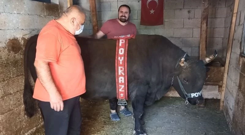 Artvin’in Yusufeli ilçesinde boğa yetiştiriciliği yapan eski milli güreşçi Aykut Yılmaz, geçtiğimiz aylarda baba olmanın mutluluğunu yaşadı. Yağız Ateş ismini verdiği oğluna Ramazan bayramı öncesi bayramlık aldı. Vicdanı rahat etmeyen Yılmaz, 6 yıldır gözü gibi baktığı ve oğlundan ayırt etmediği 800 kilogramlık ‘Poyraz’ isimli boğasına da bayramlık almaya karar verdi. Ege bölgesinden özel sipariş verdiği ve üzerinde ‘Poyraz’ yazılı kemer, boyunluk ve bileklik alarak bayram öncesi boğasına taktı.