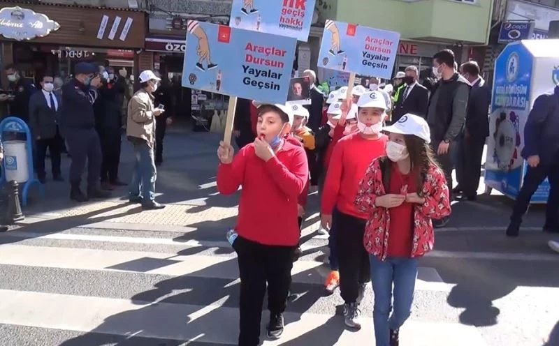 Öğrenciler düdükle yaya önceliğine dikkat çektiler