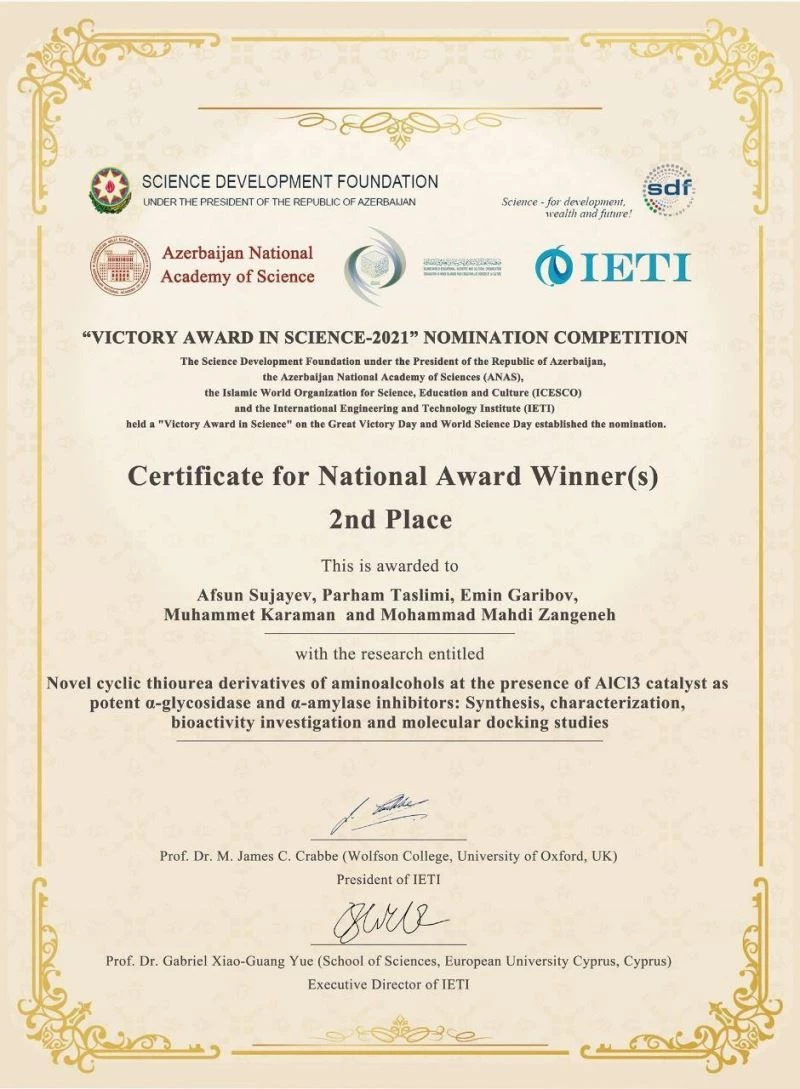 7 Aralık Üniversitesi Moleküler Biyoloji ve Genetik Bölümü Öğretim Üyelerinden Dr. Öğr. Üyesi Muhammet Karaman’ın, Türkiye, Azerbaycan ve İran’ın farklı üniversitelerindeki bilim insanları ile gerçekleştirdiği “Novel cyclic thiourea derivatives of aminoalcohols at the presence of AlCl3 catalyst as potent -glycosidase and -amylase inhibitors: Synthesis, characterization, bioactivity investigation and molecular docking studies” başlıklı araştırma makalesi, Azerbaycan Cumhuriyeti Cumhurbaşkanlığı, Azerbaycan Ulusal Bilimler Akademisi ve İslam Dünyası Eğitim, Bilim ve Kültür Teşkilatı tarafından düzenlenen "Victory Award in Science - 2021" yarışmasında ikincilik ile ödüllendirildi.