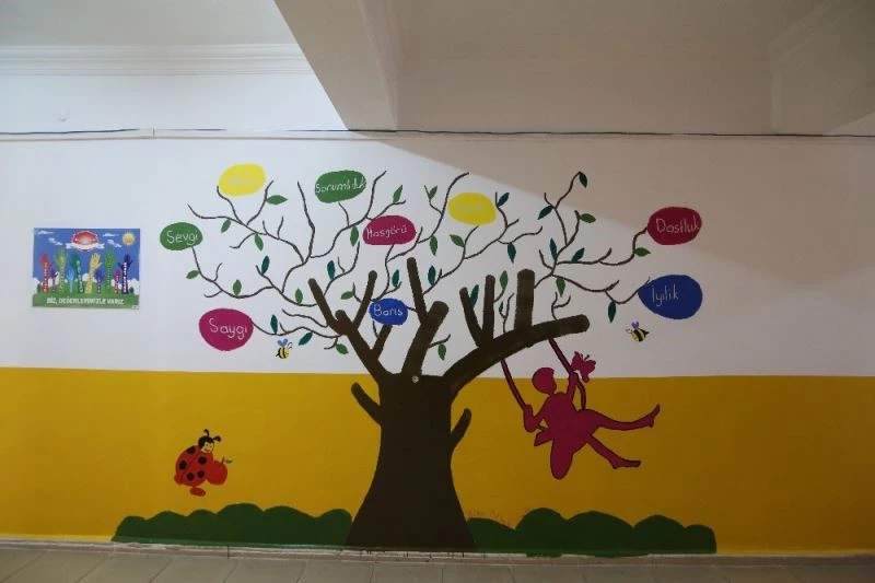 Sivas’ın Yıldızeli ilçesinde bir grup öğretmen görev yaptıkları okulu daha renkli bir görünüm kazandırmak için boş duvarlara resimler çizip boyadılar.