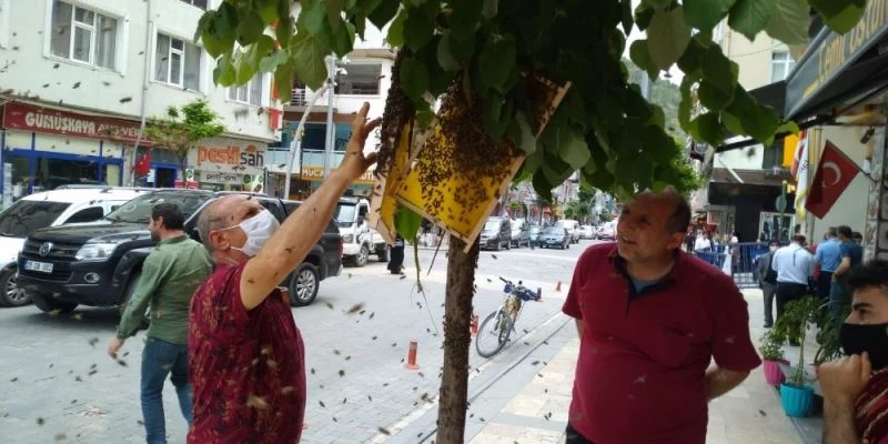 Oğul veren arılar cadde ortasındaki ağaca konunca paniğe neden oldu