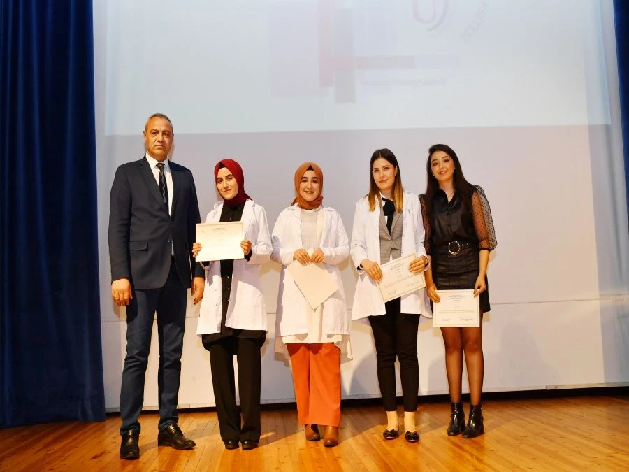 Osmaniye Korkut Ata Üniversitesi (OKÜ) Sağlık Bilimleri Fakültesi'nde, Onur ve Yüksek Onur Belgesi almaya hak kazanan Hemşirelik, Beslenme ve Diyetetik Bölümleri öğrencileri düzenlenen törenle belgelerini alıp, beyaz önlüklerini giydiler. 15 Temmuz Şehitler Amfisi'nde ki yörenin açılış konuşmasını, Sağlık Bilimleri Fakültesi Hemşirelik Bölümü 1.sınıfların dönem birincisi Elif Kozan ile Beslenme ve Diyetetik Bölümü 1. sınıfların dönem birincisi Meliha Gölcü yaptı. Elif Kozan, "Bizler hayatın getireceklerini ön göremediğimiz bir dönemde yaptığımız meslek seçimi ile üniversite yaşamına başladığımızda hemşireliği daha çok kalıplaşmış ifadelerle tanımlıyorduk. Ancak almaya başladığımız eğitim ile gerçek anlamdaki hemşireliği, hemşireliğin temeli olan bakım kavramını, insan ve topluma olan sorumlulukları öğrenerek profesyonel bir meslek edinmiş olma yolunda ilerliyoruz. Hemşirelik mesleğini, felsefesini, hedeflerini, kuramsal bilgi ve becerilerini teorik ve uygulamalı derslerle bizlere öğreten hocalarımıza teşekkür ediyorum." dedi. Meliha Gölcü ise konuşmasında Beslenme ve Diyetetik Bölümü hakkında bilgiler verdi. Kozan ve Gölcü' den sonra OKÜ Rektör Yardımcısı ve Sağlık Bilimleri Fakültesi Dekanı Prof. Dr. Alpaslan Dayangaç ile Rektör Prof. Dr. Murat Türk de kısa birer konuşma yaptı. Konuşmasına İdlib şehitlerine Allah'tan rahmet dileyerek başlayan Sağlık Bilimleri Fakültesi Dekanı Prof. Dr. Alpaslan Dayangaç, "Sağlık Bilimleri Fakültesi'nde 6 bölüm bulunmaktadır. Eğitim öğretim faaliyetlerini toplamda 29 Öğretim Üyesi ile sürdürüyoruz. 2020-2021 eğitim öğretim yılında Ebelik Bölümü ve Sosyal Hizmetler Bölümü'ne öğrenci alımı için Yükseköğretim Kurumuna başvurumuz gerçekleşecek. Eğitimde teorik ve pratik olarak öğrencilerimizin gelişmesine katkıda bulunan Öğretim Üyesi arkadaşlarımıza teşekkür ediyorum." dedi. Rektör Prof. Dr. Murat Türk ise yaptığı konuşmada sağladıkları destek için Sağlık İl Müdürlüğü ve Osmaniye Devlet Hastanesi Başhekimliğine teşekkür etti. Konuşmaların ardından Onur ve Yüksek Onur Belgesi almaya hak kazanan Hemşirelik, Beslenme ve Diyetetik Bölümleri öğrencilerine belgeleri verildi ve ardından önlüklerini giydiler. Tören toplu fotoğraf çekiminin ardından 15 Temmuz Şehitler Amfisi fuaye alanında düzenlenen kokteyl ile sona erdi.
