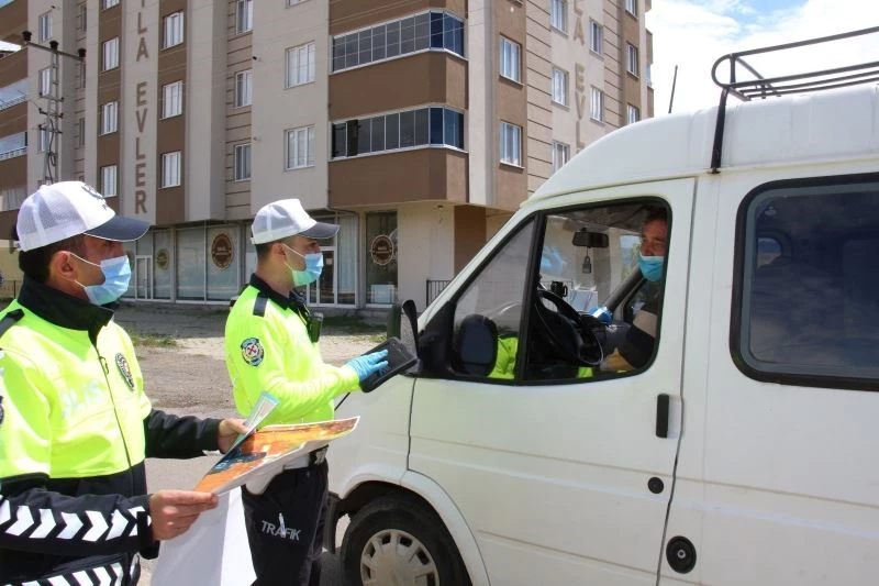 Pandemi sürecinde Oltu Bölge Trafik İstasyonu önünde yapılan uygulamada sürücülere trafik bilinci oluşturmak için broşür dağıtıp sürücülerin evrak kontrolü yapıldı.